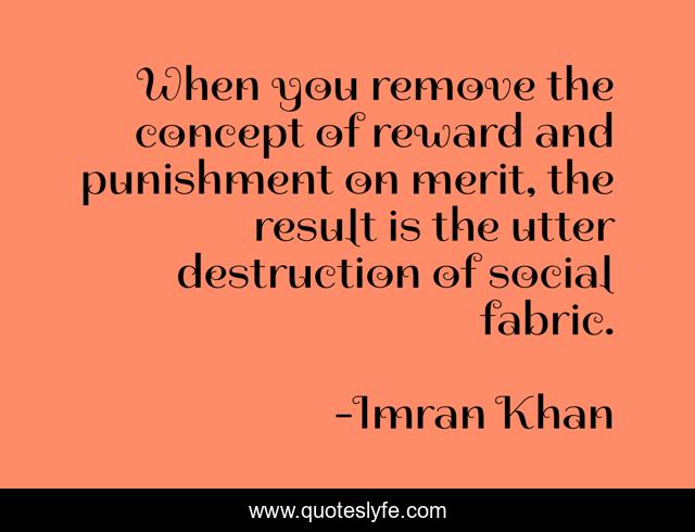 This page presents the quote "When you remove the concept of reward and punishment on merit, the result is the utter destruction of social fabric.". Author of this quote is Imran Khan. This quote is about reward, evil,.