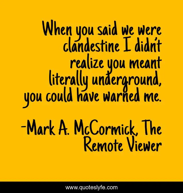 This page presents the quote "When you said we were clandestine I didn’t realize you meant literally underground, you could have warned me.". Author of this quote is Mark A. McCormick, The Remote Viewer. This quote is about action, psychic, thriller-action-packed-suspense, fictional,.
