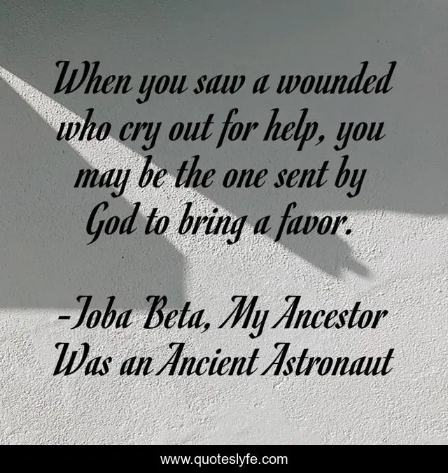 This page presents the quote "When you saw a wounded who cry out for help, you may be the one sent by God to bring a favor.". Author of this quote is Toba Beta, My Ancestor Was an Ancient Astronaut. This quote is about favor, help, god, wounded,.