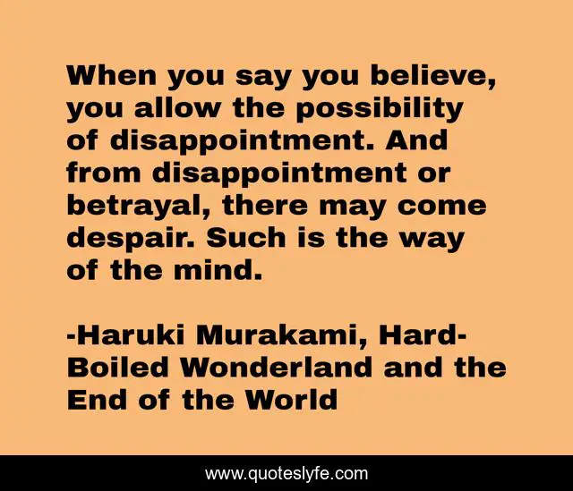 This page presents the quote "When you say you believe, you allow the possibility of disappointment. And from disappointment or betrayal, there may come despair. Such is the way of the mind.". Author of this quote is Haruki Murakami, Hard-Boiled Wonderland and the End of the World. This quote is about belief, disappointment,.