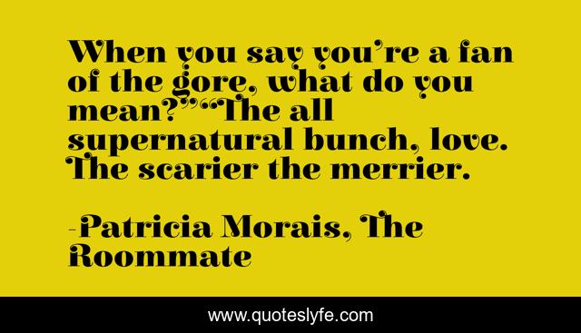 This page presents the quote "When you say you’re a fan of the gore, what do you mean?”“The all supernatural bunch, love. The scarier the merrier.". Author of this quote is Patricia Morais, The Roommate. This quote is about scary, supernatural, gore,.