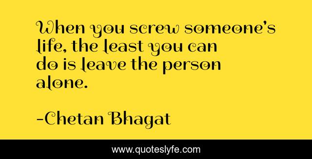 This page presents the quote "When you screw someone's life, the least you can do is leave the person alone.". Author of this quote is Chetan Bhagat. This quote is about loneliness-of-love, love-hurts,.