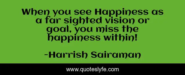 This page presents the quote "When you see Happiness as a far sighted vision or goal, you miss the happiness within!". Author of this quote is Harrish Sairaman. This quote is about within, goal, happiness,.