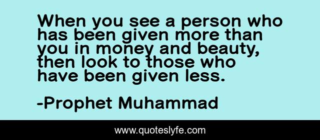 This page presents the quote "When you see a person who has been given more than you in money and beauty, then look to those who have been given less.". Author of this quote is Prophet Muhammad. This quote is about muslim, prophet-muhammad, hadith, islam,.