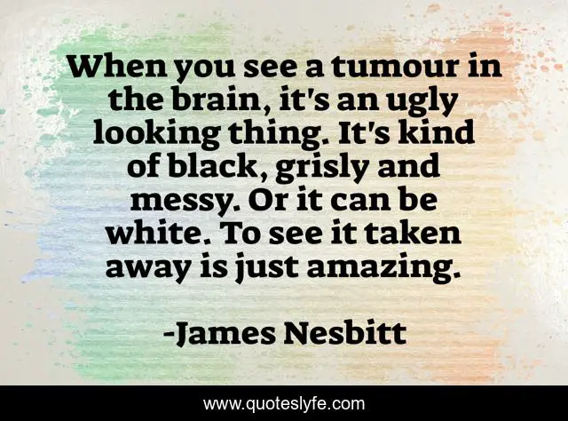 This page presents the quote "When you see a tumour in the brain, it's an ugly looking thing. It's kind of black, grisly and messy. Or it can be white. To see it taken away is just amazing.". Author of this quote is James Nesbitt. This quote is about looking, brain, black,.