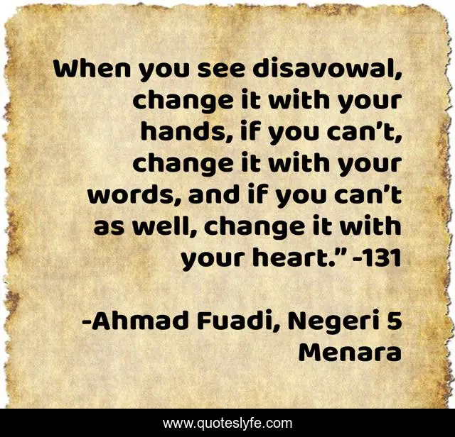 This page presents the quote "When you see disavowal, change it with your hands, if you can’t, change it with your words, and if you can’t as well, change it with your heart.” -131". Author of this quote is Ahmad Fuadi, Negeri 5 Menara. This quote is about perubahan, disavowal, change,.