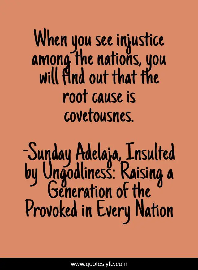 This page presents the quote "When you see injustice among the nations, you will find out that the root cause is covetousnes.". Author of this quote is Sunday Adelaja, Insulted by Ungodliness: Raising a Generation of the Provoked in Every Nation. This quote is about nations, insulted-by-ungodliness, provoke, justice, god, calling, role, purpose, significance,.