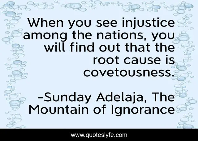 This page presents the quote "When you see injustice among the nations, you will find out that the root cause is covetousness.". Author of this quote is Sunday Adelaja, The Mountain of Ignorance. This quote is about mountain, life, darkness, power, danger, god, people, ignorance, nation,.