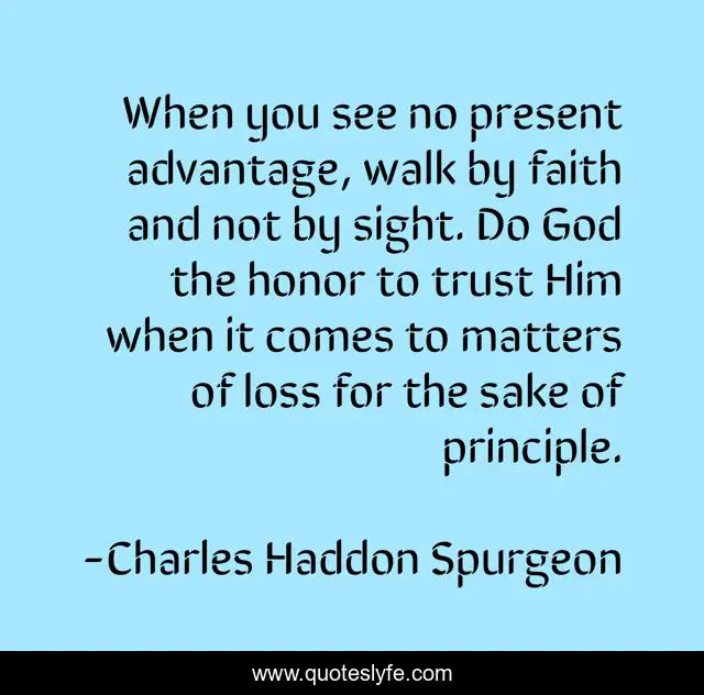 This page presents the quote "When you see no present advantage, walk by faith and not by sight. Do God the honor to trust Him when it comes to matters of loss for the sake of principle.". Author of this quote is Charles Haddon Spurgeon. This quote is about faith, principle,.