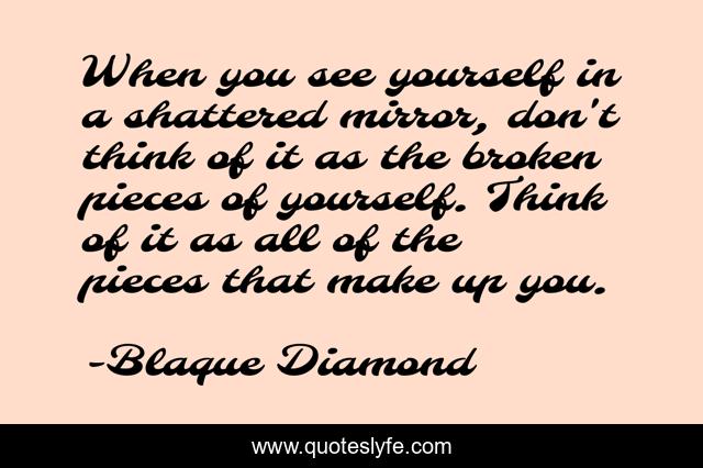 This page presents the quote "When you see yourself in a shattered mirror, don't think of it as the broken pieces of yourself. Think of it as all of the pieces that make up you.". Author of this quote is Blaque Diamond. This quote is about faith, life, eye-opening, love, inspirational, joy, motivational, peace, motivation,.