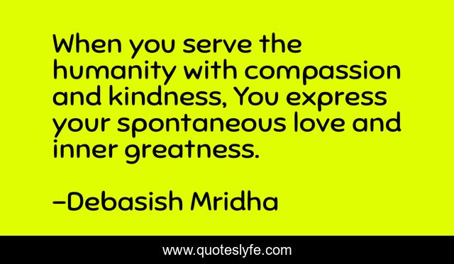 This page presents the quote "When you serve the humanity with compassion and kindness, You express your spontaneous love and inner greatness.". Author of this quote is Debasish Mridha. This quote is about life, debasish, love, compassion, mridha, philosophy, greatness, kindness, humanity,.
