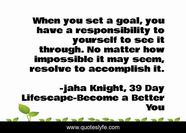 This page presents the quote "When you set a goal, you have a responsibility to yourself to see it through. No matter how impossible it may seem, resolve to accomplish it.". Author of this quote is jaha Knight, 39 Day Lifescape-Become a Better You. This quote is about goal-setting-tips, goals-in-life, goal-achievement, goals-priorities, priorities, goal-oriented, goal-setting,.