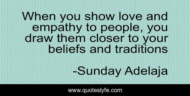 This page presents the quote "When you show love and empathy to people, you draw them closer to your beliefs and traditions". Author of this quote is Sunday Adelaja. This quote is about life, empathy, love, finance, money, blessing, job, jobless, purpose,.
