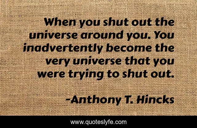 This page presents the quote "When you shut out the universe around you. You inadvertently become the very universe that you were trying to shut out.". Author of this quote is Anthony T. Hincks. This quote is about life, being, universe, philosophy, shut, around-you, shut-out, become,.