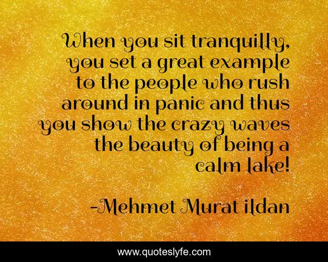 This page presents the quote "When you sit tranquilly, you set a great example to the people who rush around in panic and thus you show the crazy waves the beauty of being a calm lake!". Author of this quote is Mehmet Murat ildan. This quote is about crazy, beauty, sit, calm-lake, rush-around, rush, lake, waves, tranquil,.