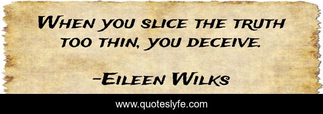 This page presents the quote "When you slice the truth too thin, you deceive.". Author of this quote is Eileen Wilks. This quote is about lie, lupi, truth, deception, trust, mortal-danger,.