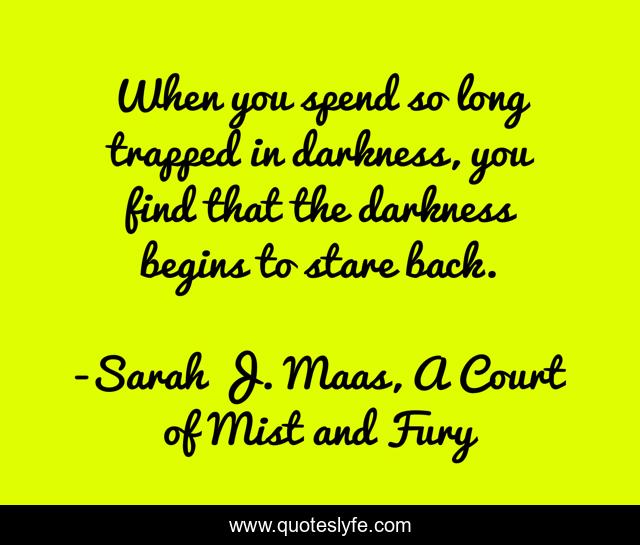 This page presents the quote "When you spend so long trapped in darkness, you find that the darkness begins to stare back.". Author of this quote is Sarah J. Maas, A Court of Mist and Fury. This quote is about feyre, acomaf, a-court-of-mist-and-fury, darkness,.