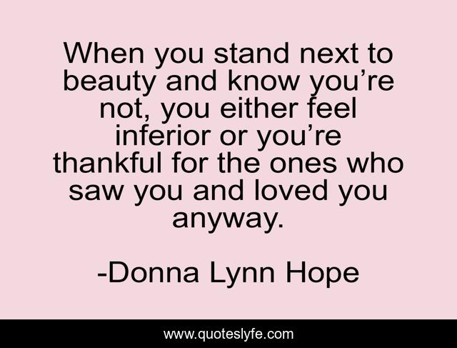 This page presents the quote "When you stand next to beauty and know you’re not, you either feel inferior or you’re thankful for the ones who saw you and loved you anyway.". Author of this quote is Donna Lynn Hope. This quote is about beautiful, intimidating, beauty, women,.