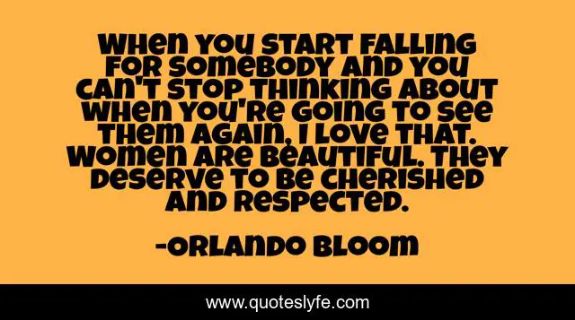 This page presents the quote "When you start falling for somebody and you can't stop thinking about when you're going to see them again, I love that. Women are beautiful. They deserve to be cherished and respected.". Author of this quote is Orlando Bloom. This quote is about beautiful, love, affection, women,.