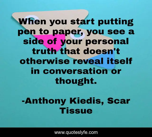This page presents the quote "When you start putting pen to paper, you see a side of your personal truth that doesn't otherwise reveal itself in conversation or thought.". Author of this quote is Anthony Kiedis, Scar Tissue. This quote is about truth, writing,.