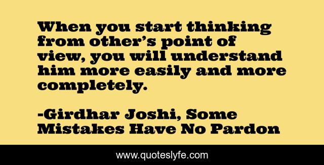 This page presents the quote "When you start thinking from other’s point of view, you will understand him more easily and more completely.". Author of this quote is Girdhar Joshi, Some Mistakes Have No Pardon. This quote is about point-of-view, understanding,.