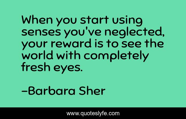 This page presents the quote "When you start using senses you've neglected, your reward is to see the world with completely fresh eyes.". Author of this quote is Barbara Sher. This quote is about world, eyes, start,.