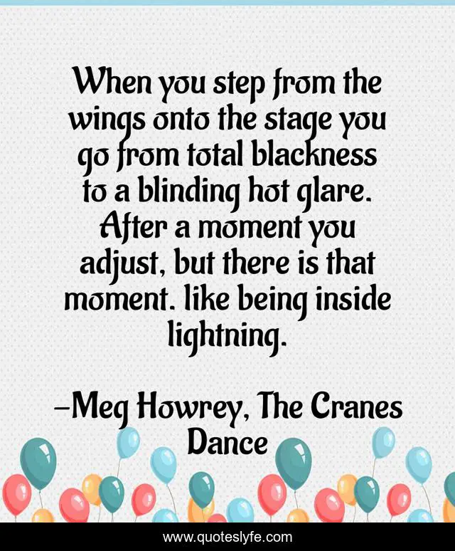 This page presents the quote "When you step from the wings onto the stage you go from total blackness to a blinding hot glare. After a moment you adjust, but there is that moment. like being inside lightning.". Author of this quote is Meg Howrey, The Cranes Dance. This quote is about dance, performance, art, theatre,.