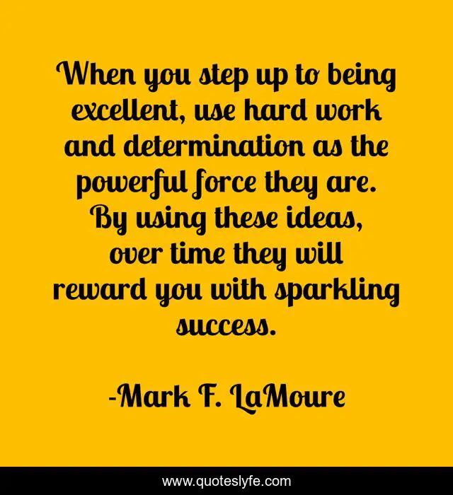 This page presents the quote "When you step up to being excellent, use hard work and determination as the powerful force they are. By using these ideas, over time they will reward you with sparkling success.". Author of this quote is Mark F. LaMoure. This quote is about exceptional-people, high-caliber, success, positive, excellent-people, excellent, confidence, excellence, self-improvement,.