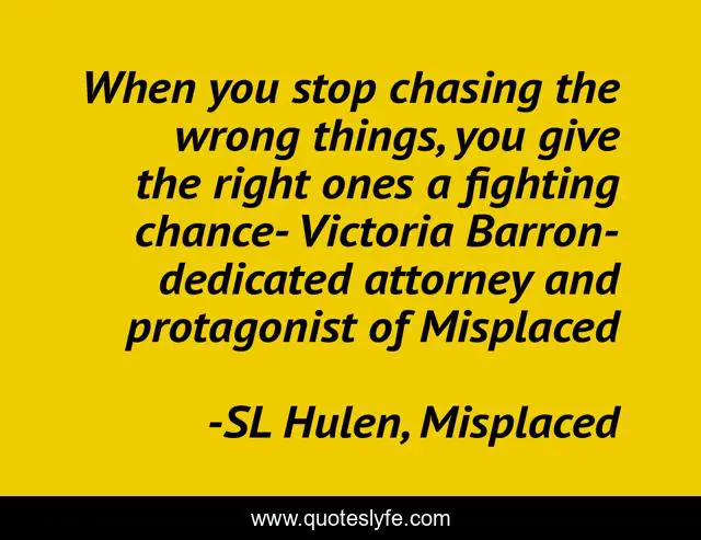 This page presents the quote "When you stop chasing the wrong things, you give the right ones a fighting chance- Victoria Barron- dedicated attorney and protagonist of Misplaced". Author of this quote is SL Hulen, Misplaced. This quote is about ancient-egypt, magical-realism, time-travel,.