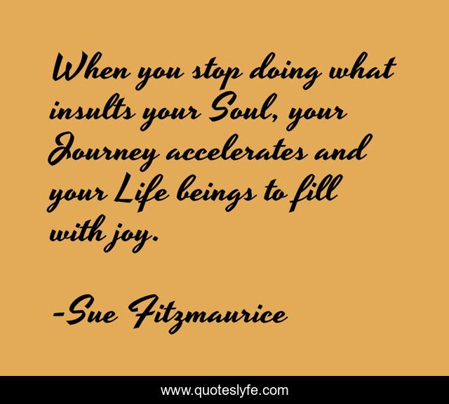 This page presents the quote "When you stop doing what insults your Soul, your Journey accelerates and your Life beings to fill with joy.". Author of this quote is Sue Fitzmaurice. This quote is about life, joy, soul, journey, purpose, inspirational, enthusiasm,.