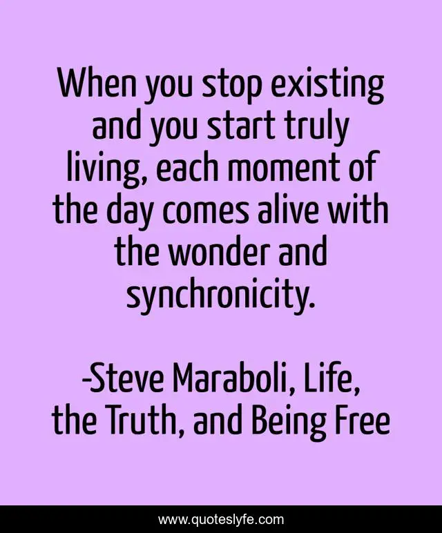 This page presents the quote "When you stop existing and you start truly living, each moment of the day comes alive with the wonder and synchronicity.". Author of this quote is Steve Maraboli, Life, the Truth, and Being Free. This quote is about living, life, synchronicity, existing, inspirational, enthusiasm, choice,.