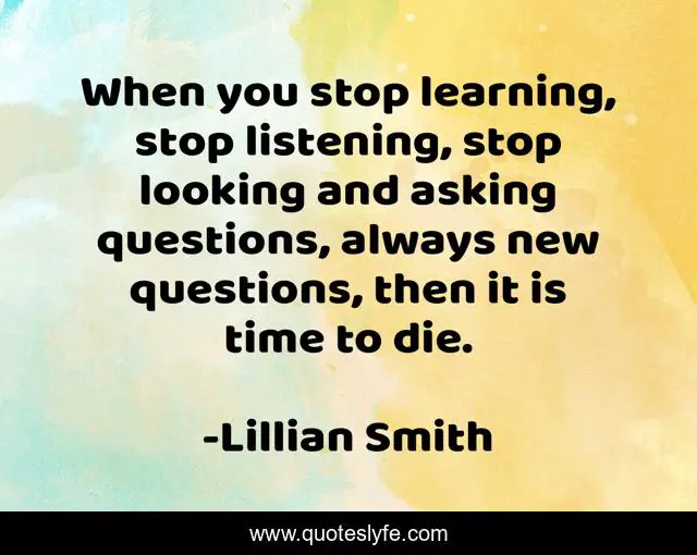 This page presents the quote "When you stop learning, stop listening, stop looking and asking questions, always new questions, then it is time to die.". Author of this quote is Lillian Smith. This quote is about looking, listening, time,.