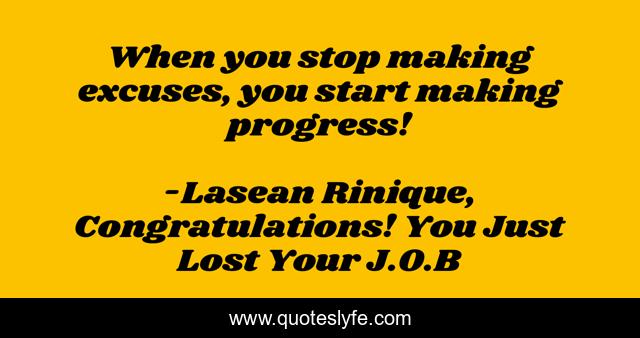 This page presents the quote "When you stop making excuses, you start making progress!". Author of this quote is Lasean Rinique, Congratulations! You Just Lost Your J.O.B. This quote is about empowerment-and-attitude, confidence-and-attitude, empowering-for-women, successful-living,.