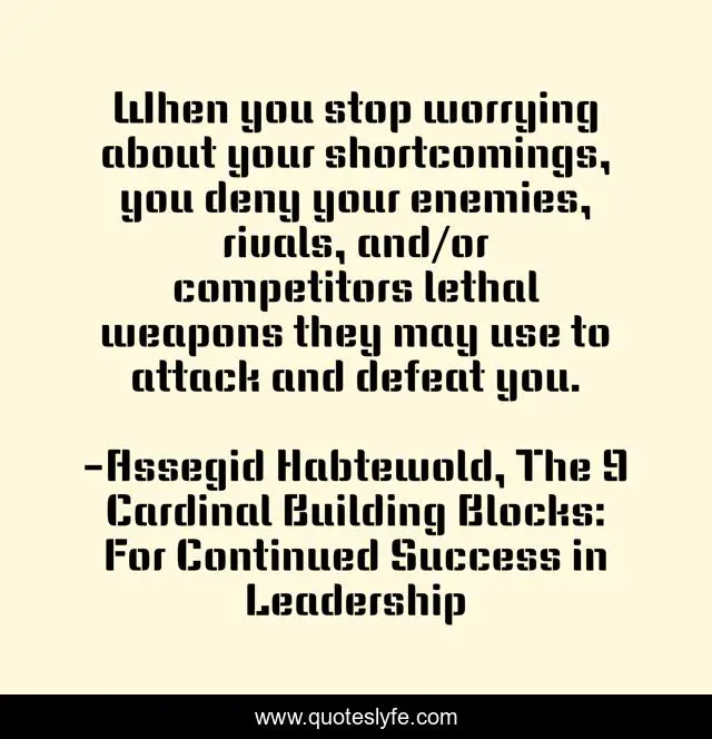 This page presents the quote "When you stop worrying about your shortcomings, you deny your enemies, rivals, and/or competitors lethal weapons they may use to attack and defeat you.". Author of this quote is Assegid Habtewold, The 9 Cardinal Building Blocks: For Continued Success in Leadership. This quote is about stop-worrying, shortcomings, lethal-weapons, rivals, competitors, enemies,.