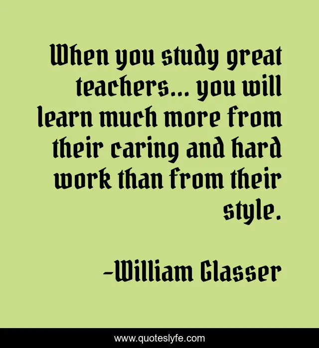 This page presents the quote "When you study great teachers... you will learn much more from their caring and hard work than from their style.". Author of this quote is William Glasser. This quote is about teaching, education, hsocial-experience, teachers,.