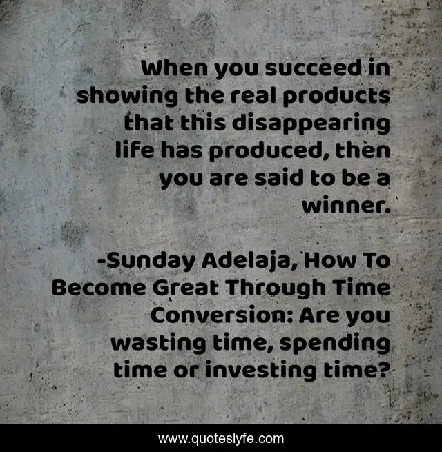 This page presents the quote "When you succeed in showing the real products that this disappearing life has produced, then you are said to be a winner.". Author of this quote is Sunday Adelaja, How To Become Great Through Time Conversion: Are you wasting time, spending time or investing time?. This quote is about life, diminishing-life, conversion, productivity, wealth, winner, greatness, waste, humanity,.