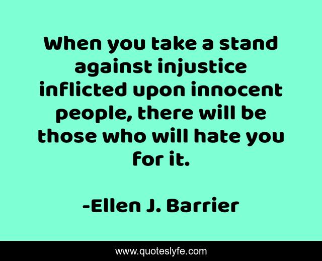 This page presents the quote "When you take a stand against injustice inflicted upon innocent people, there will be those who will hate you for it.". Author of this quote is Ellen J. Barrier. This quote is about hate, injustice, innocent, inflicted,.