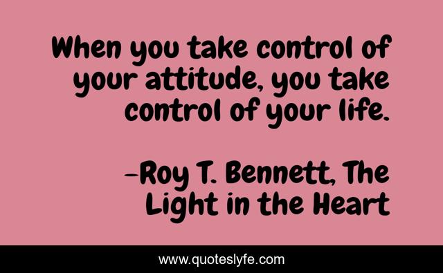 This page presents the quote "When you take control of your attitude, you take control of your life.". Author of this quote is Roy T. Bennett, The Light in the Heart. This quote is about motivation, inspire, attitude, optimistic, inspirational-life, life-and-living, living, inspiring, positive,.