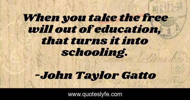 This page presents the quote "When you take the free will out of education, that turns it into schooling.". Author of this quote is John Taylor Gatto. This quote is about education-system, self-education, education, initiative,.