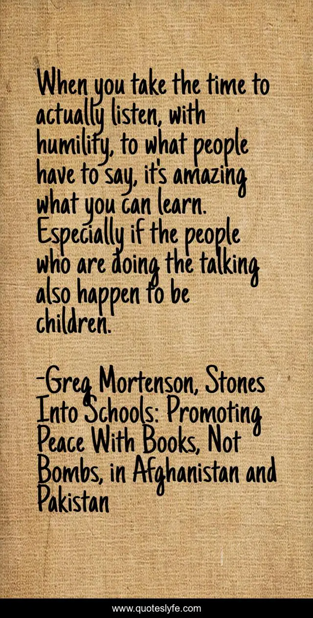 This page presents the quote "When you take the time to actually listen, with humility, to what people have to say, it's amazing what you can learn. Especially if the people who are doing the talking also happen to be children.". Author of this quote is Greg Mortenson, Stones Into Schools: Promoting Peace With Books, Not Bombs, in Afghanistan and Pakistan. This quote is about communication, education, children, parenting,.