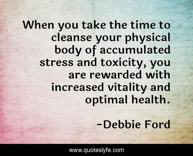This page presents the quote "When you take the time to cleanse your physical body of accumulated stress and toxicity, you are rewarded with increased vitality and optimal health.". Author of this quote is Debbie Ford. This quote is about body, stress, time,.