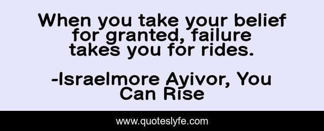 This page presents the quote "When you take your belief for granted, failure takes you for rides.". Author of this quote is Israelmore Ayivor, You Can Rise. This quote is about motivations, food-for-thought, inspirations, belief, success, grant, successful, granted, tour,.