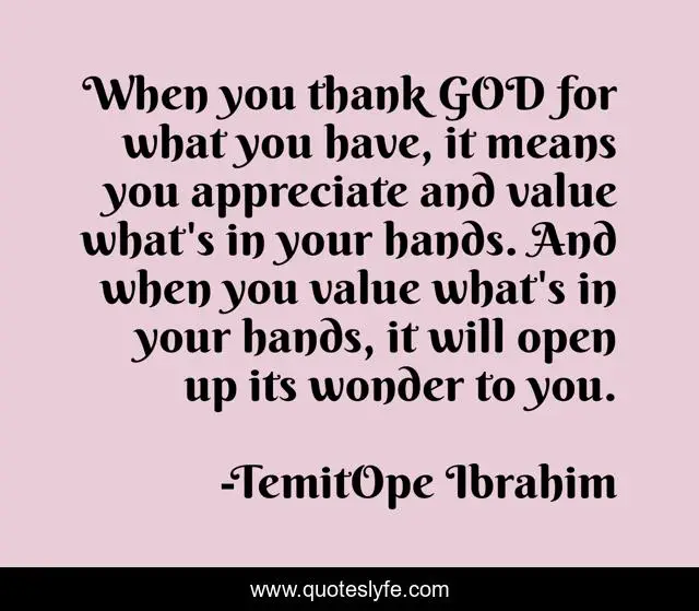 This page presents the quote "When you thank GOD for what you have, it means you appreciate and value what's in your hands. And when you value what's in your hands, it will open up its wonder to you.". Author of this quote is TemitOpe Ibrahim. This quote is about gratitude, confidence, inspirational, positive, motivational, appreciate, thanksgiving, value, more,.