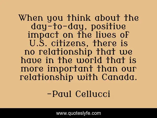 This page presents the quote "When you think about the day-to-day, positive impact on the lives of U.S. citizens, there is no relationship that we have in the world that is more important than our relationship with Canada.". Author of this quote is Paul Cellucci. This quote is about impact, world, relationship,.
