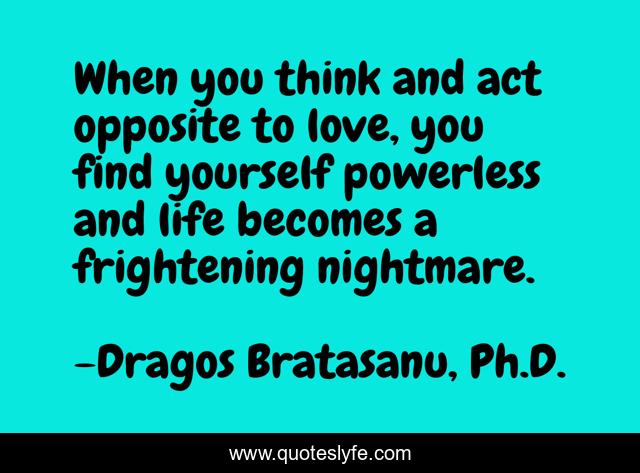 This page presents the quote "When you think and act opposite to love, you find yourself powerless and life becomes a frightening nightmare.". Author of this quote is Dragos Bratasanu, Ph.D.. This quote is about follow-your-dreams, life, love, nightmare, affection,.