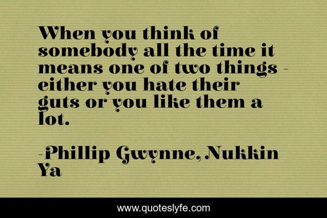 This page presents the quote "When you think of somebody all the time it means one of two things - either you hate their guts or you like them a lot.". Author of this quote is Phillip Gwynne, Nukkin Ya. This quote is about australia, love, nukkin-ya, aboriginal, young-adult, affection,.