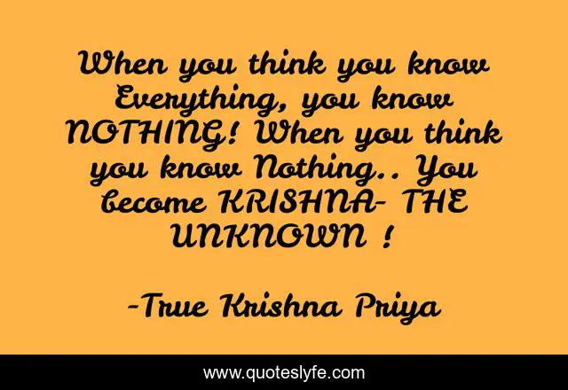 This page presents the quote "When you think you know Everything, you know NOTHING! When you think you know Nothing.. You become KRISHNA- THE UNKNOWN !". Author of this quote is True Krishna Priya. This quote is about krishna, soul, consciousness,.