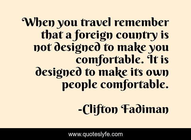 This page presents the quote "When you travel remember that a foreign country is not designed to make you comfortable. It is designed to make its own people comfortable.". Author of this quote is Clifton Fadiman. This quote is about travel, travellers,.