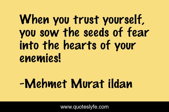 This page presents the quote "When you trust yourself, you sow the seeds of fear into the hearts of your enemies!". Author of this quote is Mehmet Murat ildan. This quote is about sow, murat-ildan, sowing-seeds, hearts, trust, self-trust, enemies,.