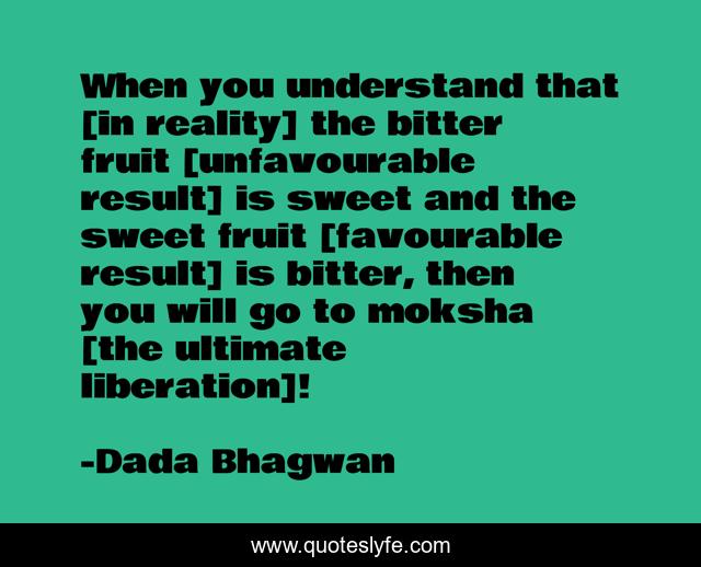 This page presents the quote "When you understand that [in reality] the bitter fruit [unfavourable result] is sweet and the sweet fruit [favourable result] is bitter, then you will go to moksha [the ultimate liberation]!". Author of this quote is Dada Bhagwan. This quote is about spiritual, moksha, ultimate-liberation, result,.
